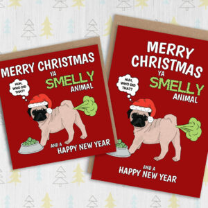 Funny Pug Christmas card: Merry Christmas ya smelly animal and a Happy New Year
