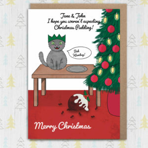 Personalised cat, bah humbug Christmas, holidays card: I hope you weren’t expecting Christmas pudding