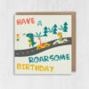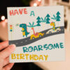 Dinosaur, dino car race children, kid, child, boy, girl birthday card: Have a roarsome birthday (Size A6/A5/A4/Square 6×6″)