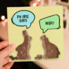 My arse hurts. What? Funny, rude chocolate bunnies, rabbits, bums, bottoms Easter card for adults (Size A6/A5/A4/Square 6×6″)