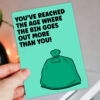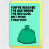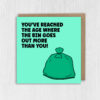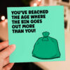 Funny rude, old age old man, old lady birthday card: You’ve reached the age where the bin goes out more than you (Size A6/A5/A4/Square 6×6″)