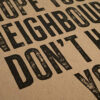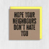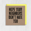 Funny new home, new house, housewarming, moving house, moving home kraft card: Hope your neighbours/neighbors don’t hate you